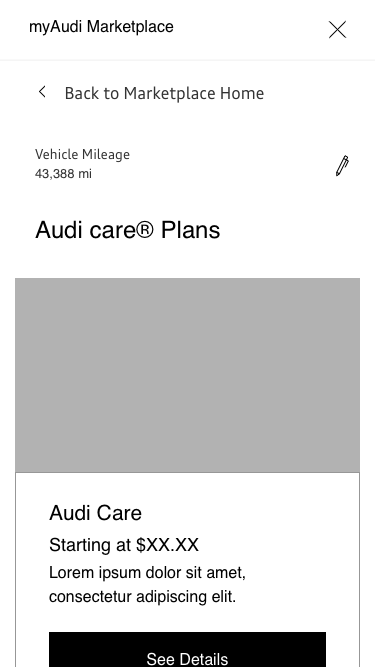 Another authentication point for product purchase was vehicle mileage for Audi care products. Audi care products are bundled service plans where Audi owners can have their car serviced at predetermined mileage points such as when their car is at 25k miles, and at 35k miles. To mitigate confusion and only show products that customers are eligible for, we prompt the user to enter their vehicle mileage upon entering the Audi care category.